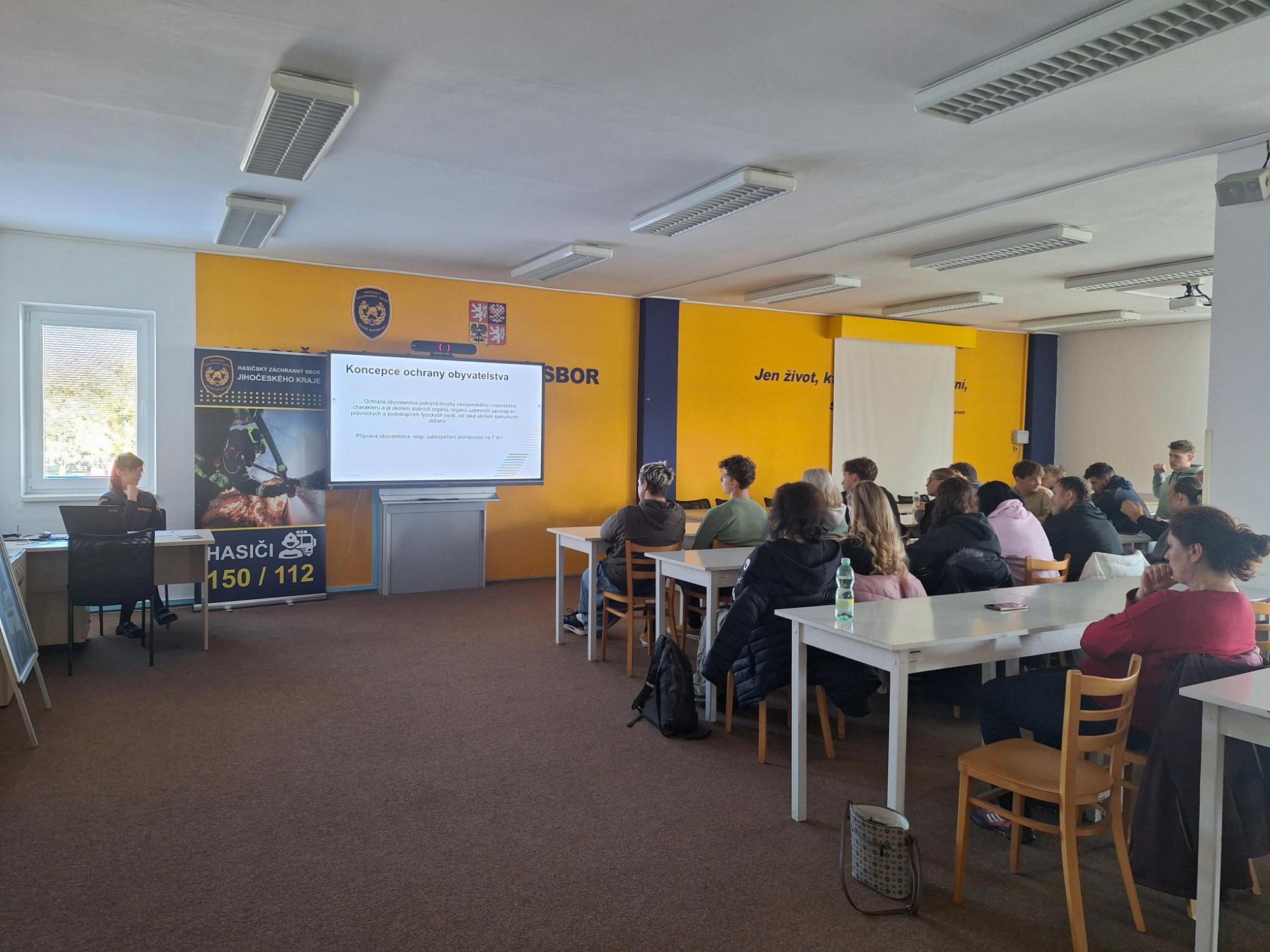 Po přivítání kpt. Mgr. Kalnou byli žáci seznámeni se základními úkoly HZS – ochranou obyvatelstva před požáry, přírodními katastrofami a následky dopravních nehod. Dozvěděli se, že HZS v regionu provozuje čtyři stanice (Český Krumlov, Kaplice, Frymburk a Křemže) a zaměstnává 96 příslušníků.