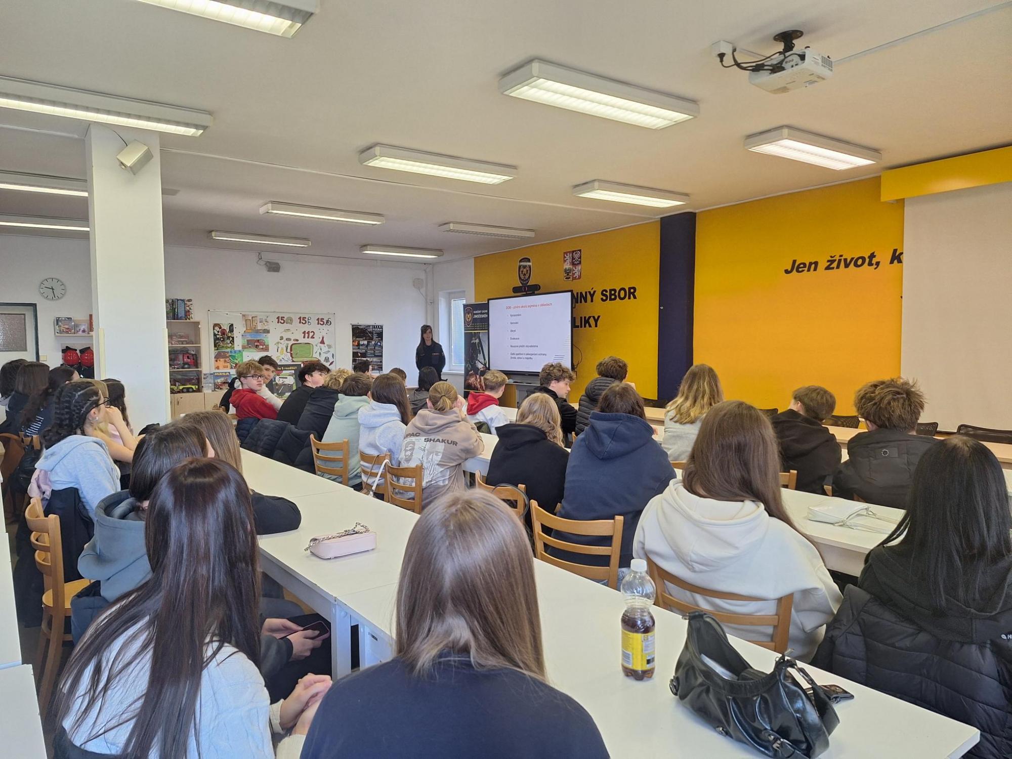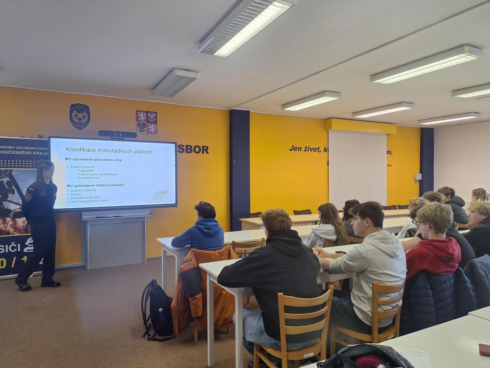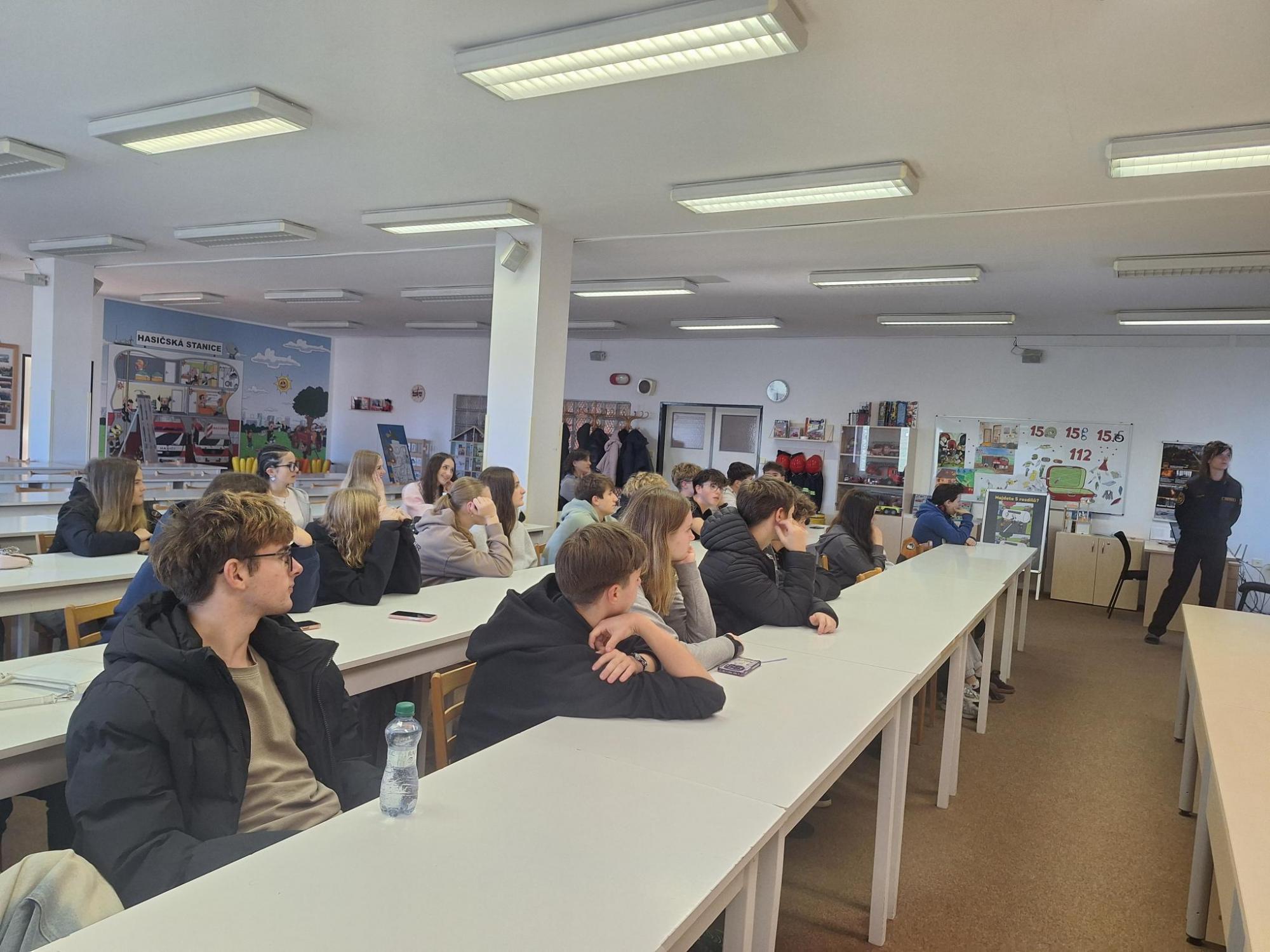 Po úvodním přivítání kpt. Mgr. Andreou Kalovou byli seznámeni se základními úkoly Hasičského záchranného sboru – ochranou obyvatelstva před požáry, přírodními katastrofami, průmyslovými haváriemi i následky dopravních nehod.