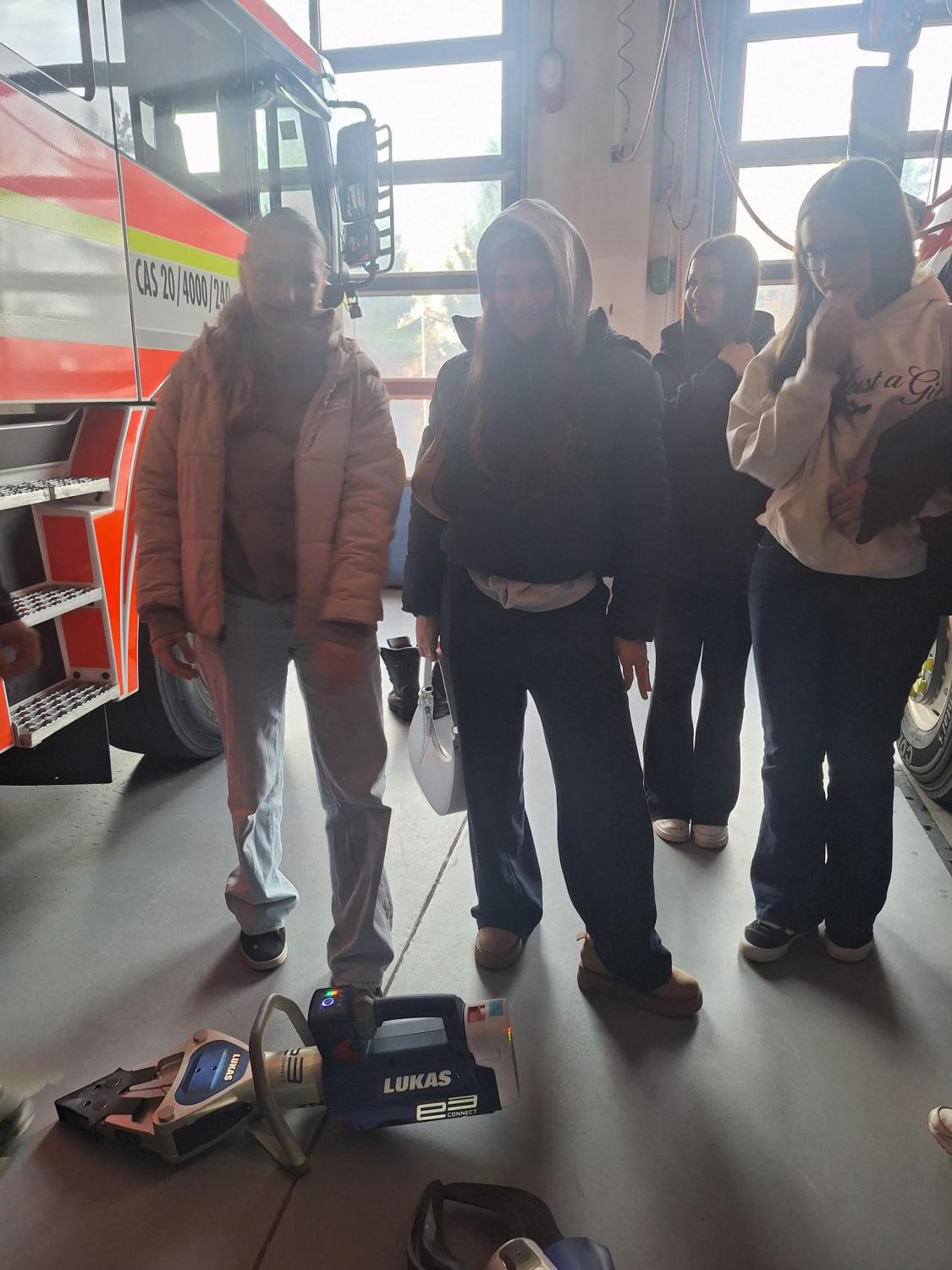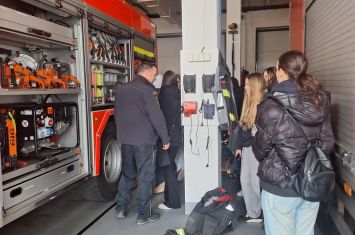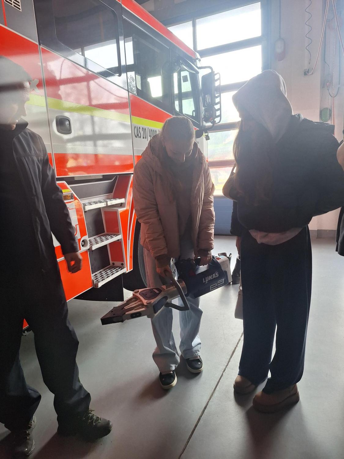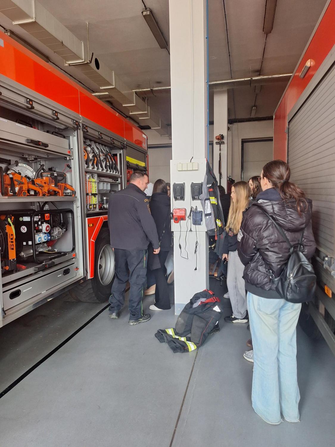 Následně byli žáci pozváni do garáží HZS, kde jim byl představen vozový park a jeho vybavení. Měli možnost nahlédnout do zásahových vozidel a seznámit se s technikou určenou k hašení požárů, záchranným pracím, vyprošťování osob při dopravních nehodách i k řešení ekologických havárií. Příslušník HZS žákům vysvětlil postupy nasazení jednotlivých vozidel a zařízení při různých typech zásahů. Dokonce žákům ukázali zásahové vozidlo, které disponuje výsuvným žebříkem v praxi. Tato část exkurze byla pro žáky velmi atraktivní, protože si mohli zblízka prohlédnout vybavení, které jinak vídají pouze v médiích.